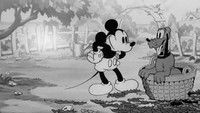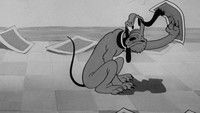 Mickey's trying to do some yardwork, but Pluto wants to play. They end up indoors; Mickey breaks a screen, spreads flypaper, and they both get stuck.