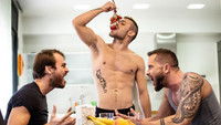 After 2 nights of having a mysterious stranger (Ricky) as their houseguest, Tyler and Max both agree it’s time for him to leave. Tensions between the husbands are high as they disagree about how to oust the houseguest, but when Ricky follows them to the bedroom and takes out his big cock, they decide he can stay a little longer! Tyler and Max take turns sucking Ricky’s big cock and getting their asses stretched by it, in a threesome that brings a bit of extra spice to their marriage. Soon Max is pounding Tyler’s ass as Ricky fucks Max doggystyle, and then it’s Tyler’s turn to fuck his husband as Max sucks Ricky’s cock till all three guys cum. But just when Tyler and Max think Ricky’s left, they learn the shocking truth…