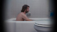 A tense man must let out his aggression in a private bathroom.