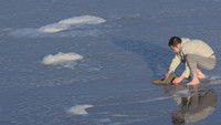 A recently hatched turtle, made of sand and by hand, returns to the sea.
