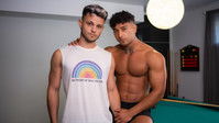 It's a hot day, and Kenzo Alvarez is just looking for a cool pick-me-up when he walks into Enzo Muller's cafe. His stunning good looks and broad bronzed shirtless body leave Enzo speechless. Despite his incredible physique, and raw masculinity Enzo insists he put on a shirt. Kenzo admits he's new to the area, and the starstruck barista offers to show him around town and invites the god-like stud over on the way to a party after work. When he arrives, Enzo takes a moment to change. Kenzo is open-minded and hasn't fucked a guy in a while. He admits his mutual attraction and their lips lock, in a moment of pure magnetism. Enzo explores the adonis' hard body and strips off his shorts to show off his assless jock briefs. He indulges in Kenzo's hole, rimming him before getting his own ass pounded from behind over the pool table. Enzo gets glanded, spraying a gigantic cum shot covering his chest before Kenzo adds his own.