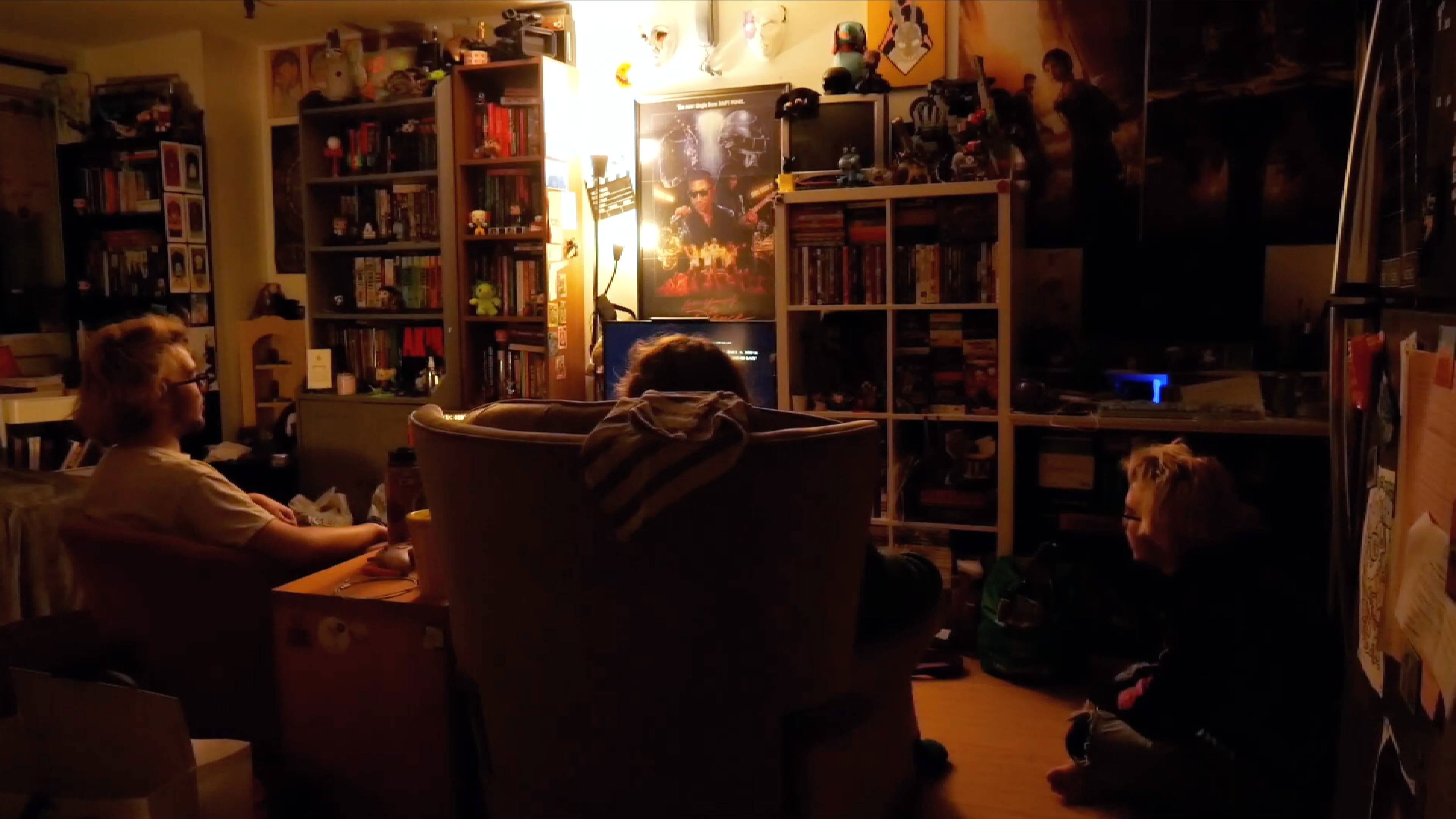 three friends conclude the second movie of a trilogy when one has to leave, but one of the hosts is furvently against that, because there's still one movie left to watch.