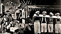 In a public place in Constantinople at the corner of a bazaar, the executioner is seated upon a stone and is resting from his daily labors while eating a crust of bread. Suddenly there come running into the place a lot of Turkish men and women preceding some Turkish policemen, who drag along four prisoners in chains. The policemen shut up the four prisoners in the pillory. Their four heads stick up through the huge plank, which is provided with four openings. One of the policemen urges the executioner to decapitate the prisoners. He accordingly seizes a mighty sabre and cuts off by a single stroke the four heads, which roll upon the ground.