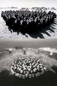 The installation features two black-and-white projections. One depicts a group of men dressed in Western suits and the other captures a group of women veiled in chador. In the work, Neshat takes on entrenched gender stereotypes by placing the men in a structured, architectural fortress and the women in a wild, natural desert. The viewer is positioned between these dichotomies, with the videos displayed on opposite walls, and is forced to shift attention from one to the other. The installation shows how established beliefs and presumptions can flourish in social and religious systems, emphasizing that these deep-rooted dynamics profoundly impact all people, indiscriminate of gender.