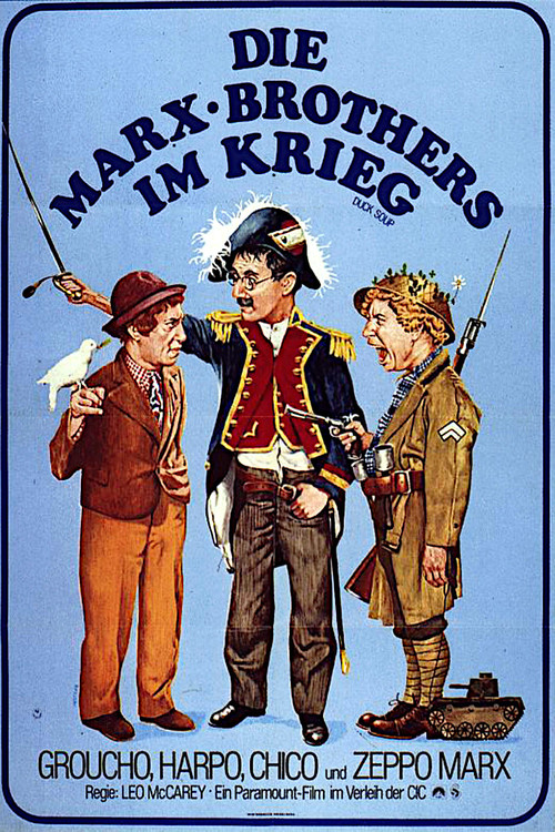 Rufus T. Firefly is named president/dictator of bankrupt Freedonia and declares war on neighboring Sylvania over the love of wealthy Mrs. Teasdale.