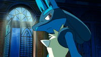 In the legendary past, before Poké Balls were invented, an aura-guiding hero Pokémon named Lucario sensed two groups of armies about to clash, and a threat of a massive war in front of Oldoran Castle in Kanto that would leave no survivors. He transferred this message to his master, the legendary hero Arlon, while he was being attacked by a violent group of Hellgar. During the battle, his sense of sight was lost and he was rendered unable to see. He used the detection of his Aura, and so with the offensive Wave Bomb, he eliminated them. Though by the threat, the queen of Rota, Lady Rin was resolute to die with her civilians, and so Arlon made a choice.
