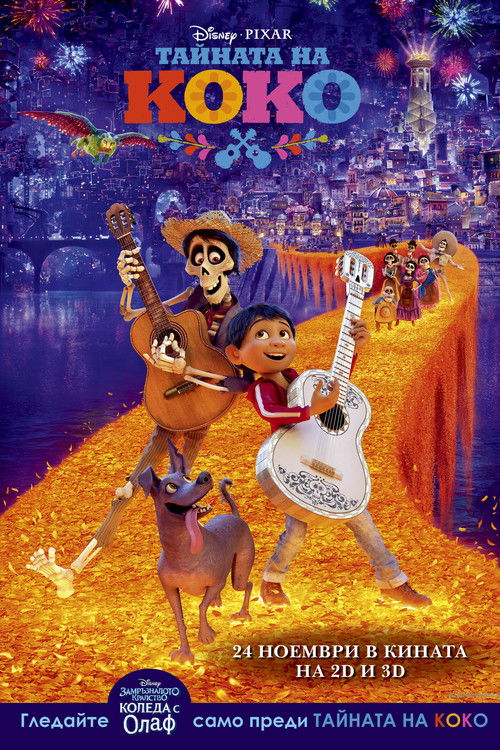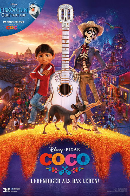 Despite his family’s baffling generations-old ban on music, Miguel dreams of becoming an accomplished musician like his idol, Ernesto de la Cruz. Desperate to prove his talent, Miguel finds himself in the stunning and colorful Land of the Dead following a mysterious chain of events. Along the way, he meets charming trickster Hector, and together, they set off on an extraordinary journey to unlock the real story behind Miguel's family history.