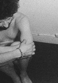 "ANGLE, with its brief black and white shots, almost always plunging and oblique, of naked bodies or parts of bodies, is a film of rupture. Punctuations of black primers break up the filmic continuity, isolating snapshots or brief furtive movements: the body rolling over itself, colliding with the other or falling (these terrible falls, as sharp as a fainting spell, like that of the hero of The Andalusian Dog, whose hand, as he falls, brushes for a moment against the naked back of a beautiful, insensitive woman, and which is, it seems to me, the most striking representation of the link between passion in love and death that can be given). Often these movements are repeated and the actors seem to be the descendants of Muybridge's bonshommes lost in a white room. At the end - this is the longest shot in the film - in a corner of the room, one of the two actors remains crouched, hiding his eyes in his hands. Then the corner reappears, empty."