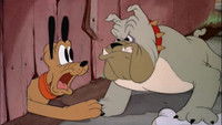 Pluto finds a bone - but also finds Butch the bulldog, who claims it for himself. Idea: Pluto paces off a distance, buried treasure style, and digs a large bone-shaped hole. Butch falls for it, and while he's digging deeper, Pluto almost makes off with the bone. Butch catches on just in time and chases Pluto, who ducks into a junkyard. The bone gets sucked into in a squeeze-bulb horn, which Pluto does battle with.